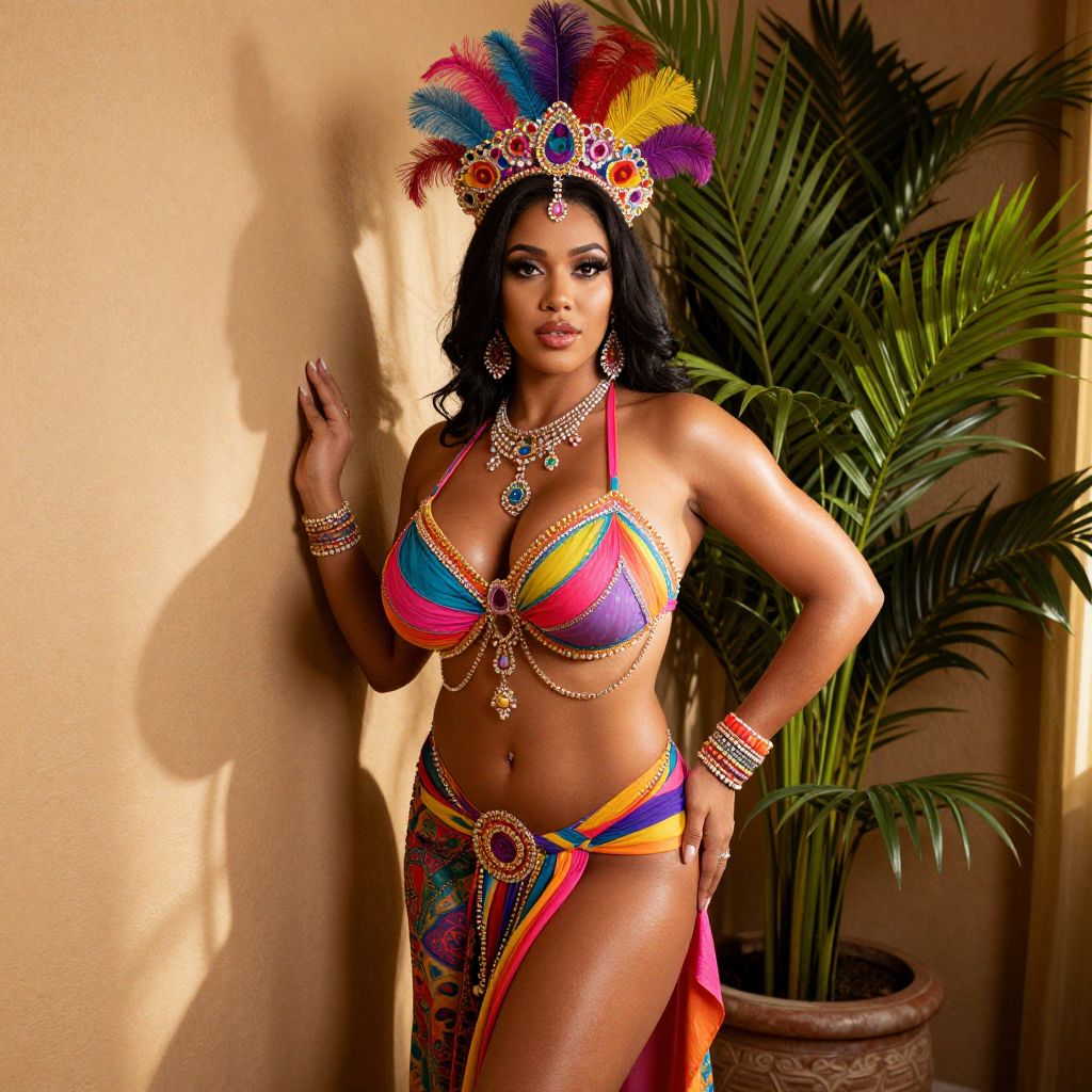 Colorful Carnival Costume Woman with Feathered Headpiece Indoors