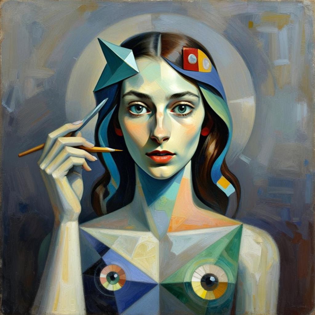 Surreal Cubist Portrait of Woman with Geometric Elements and Art Tools