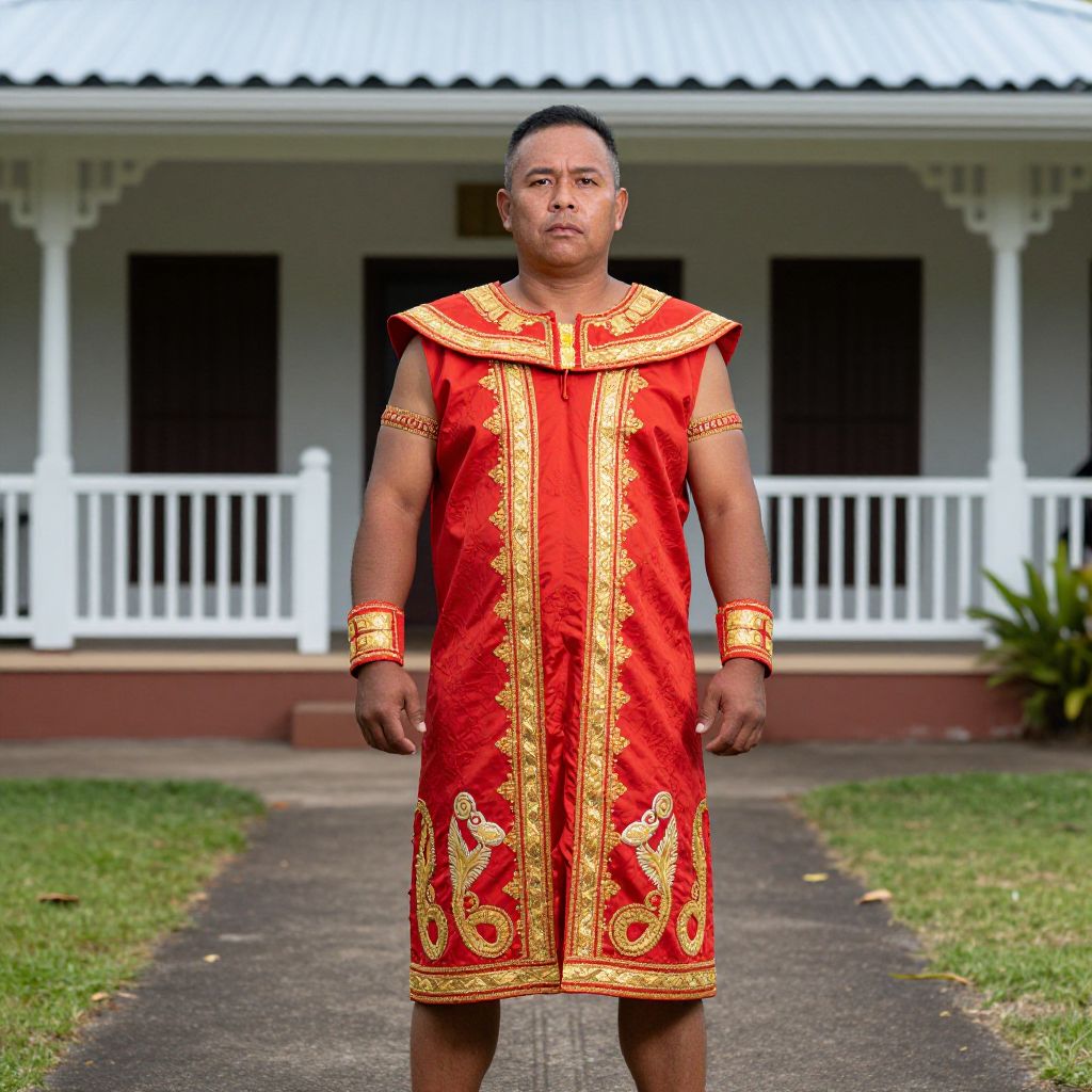 A man stands confidently outdoors wearing a traditional red garment adorned with intricate gold embroidery, complemented by matching armlets and wristbands. The background features a classic white veranda with wooden railings and doorways, highlighting the cultural significance of the attire.