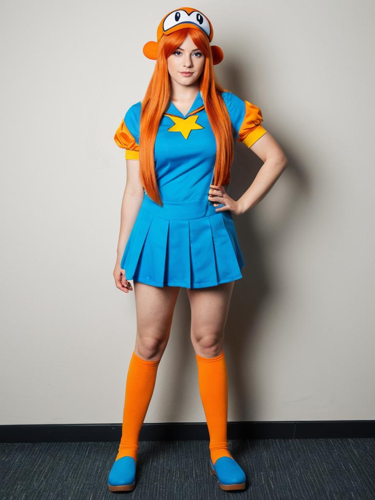 Woman Cosplaying as Mona from WarioWare in Blue and Orange Outfit