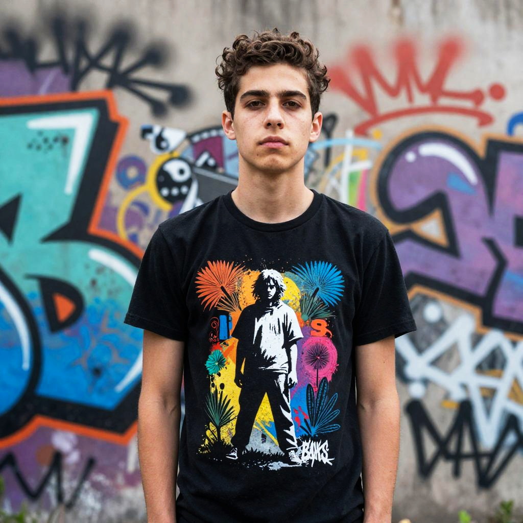 A young man with curly hair stands confidently in front of a colorful graffiti wall, wearing a black T-shirt featuring a vibrant graphic design of a silhouetted figure surrounded by abstract, floral shapes. The urban backdrop and casual streetwear style highlight a contemporary, edgy vibe associated with Gen Z culture.