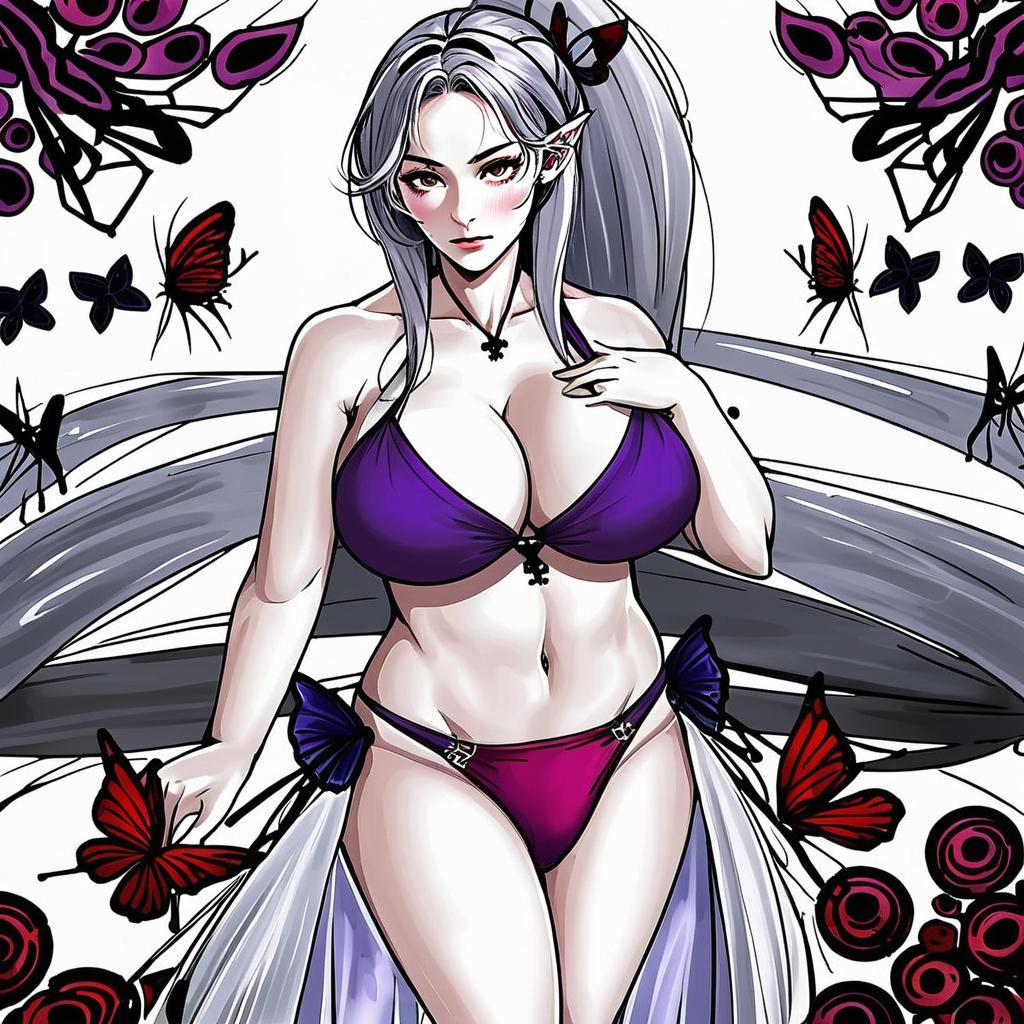 This digital anime-style illustration features a confident woman with long silver hair and elf-like ears, dressed in a striking purple bikini adorned with butterfly motifs. Surrounded by an array of vibrant red and purple butterflies, the composition blends fantasy and elegance, emphasizing the character's mysterious and alluring aura.