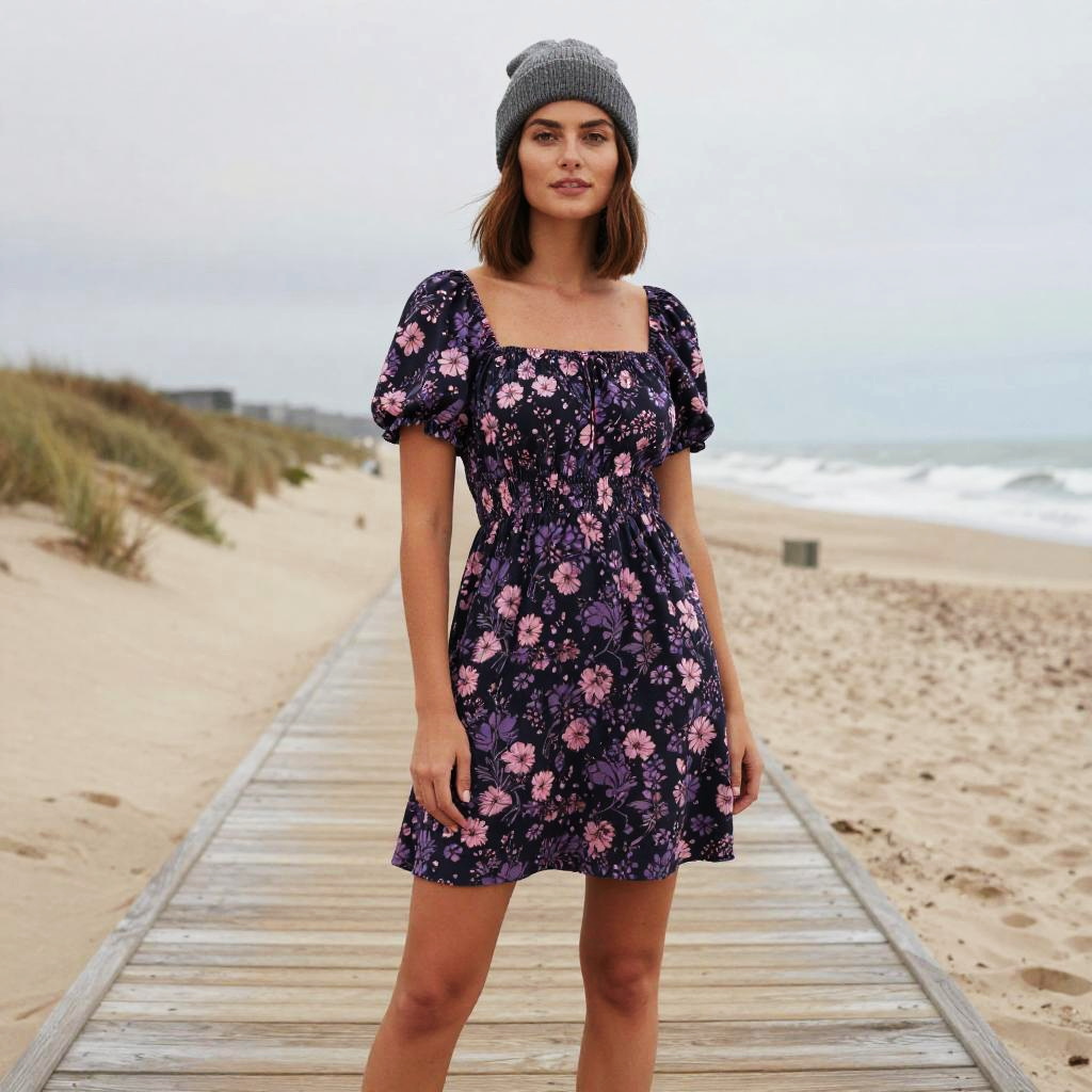 A young woman stands confidently on a wooden boardwalk by the beach, wearing a stylish floral print dress with puffed sleeves and a cozy gray knit beanie. The overcast sky and soft colors of the sea and sand create a serene, natural backdrop that complements her casual yet chic look, inspired by modern Gen Z fashion trends.
