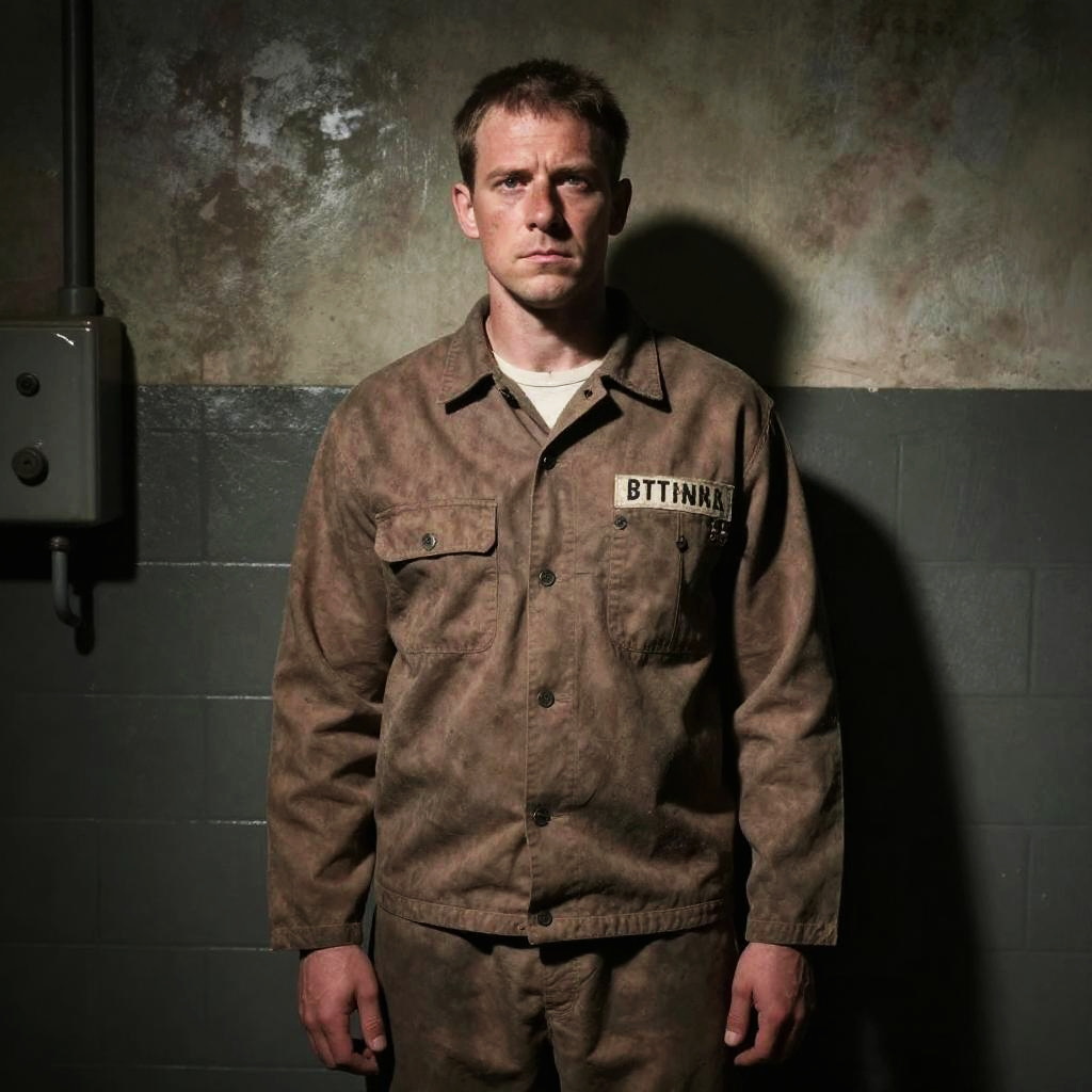 A man stands against a grimy, industrial wall wearing a worn, brown prison uniform with a name patch that reads 'BTTNKR'. The lighting casts dramatic shadows, emphasizing the gritty, somber atmosphere of confinement and hardship.