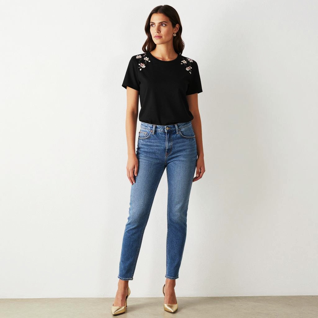 A young woman stands confidently against a plain white background, wearing a black t-shirt with delicate floral embroidery on the shoulders paired with high-waisted blue jeans and gold heels. The casual yet chic outfit represents a modern and effortless fashion style.