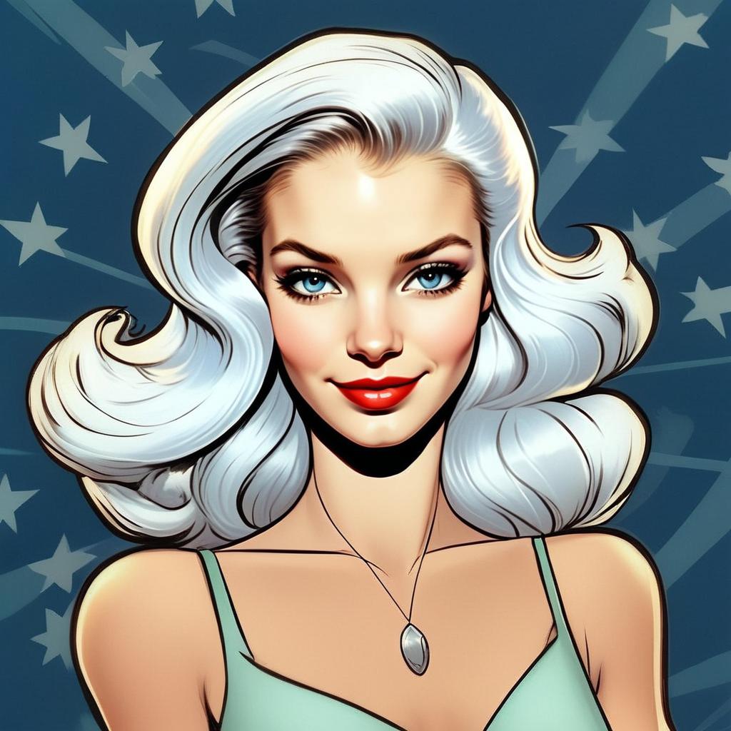 This vibrant illustration features a glamorous woman with striking white-blonde hair and bold red lips, exuding confidence and allure. The artwork showcases a retro pop art style, characterized by its bright colors and dynamic composition, creating a lively and engaging visual experience.