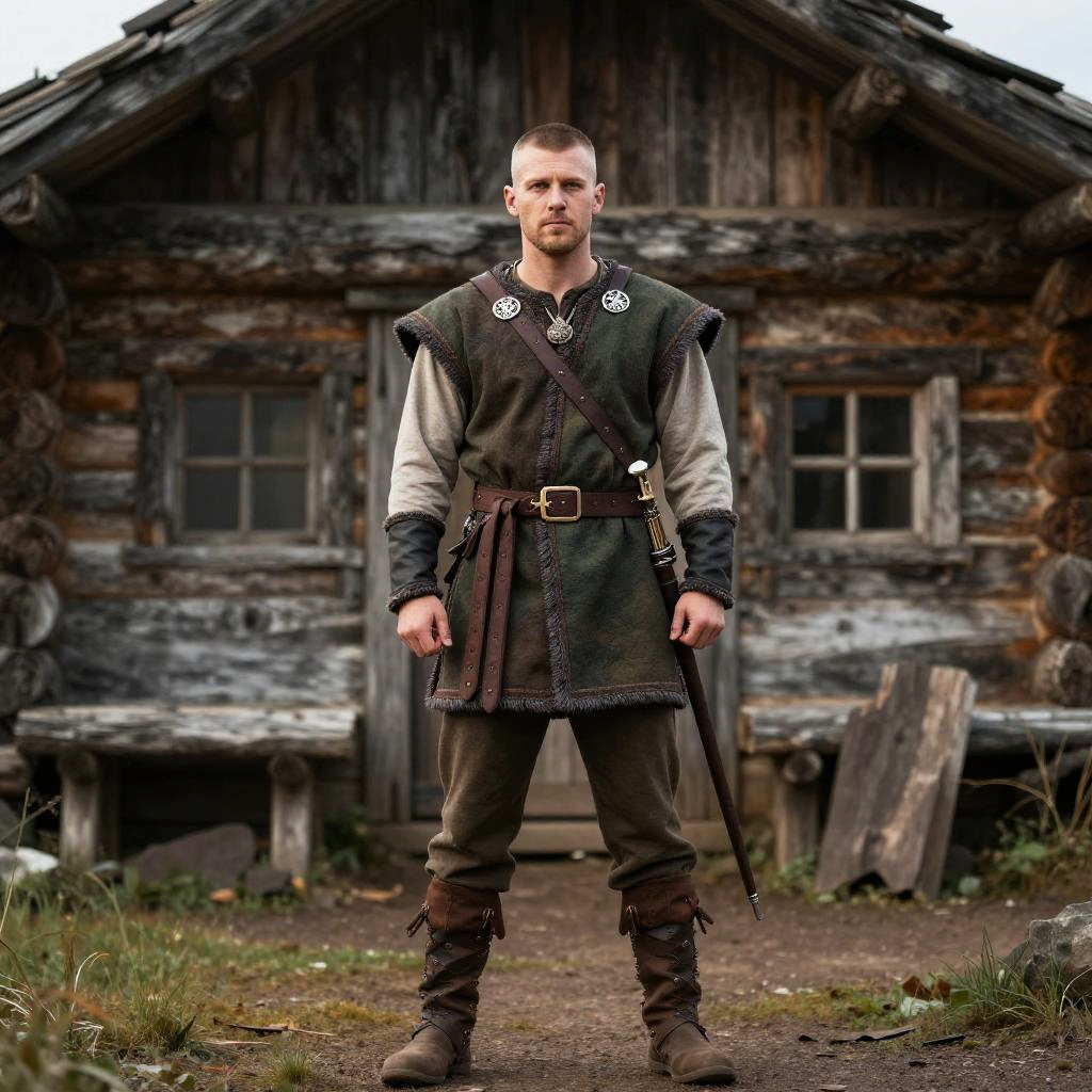 A man dressed in an authentic Viking costume stands confidently in front of a rustic wooden cabin. His outfit includes traditional Nordic elements such as leather boots, a fur-trimmed tunic, and a sheathed sword, reflecting the historic Viking warrior style.