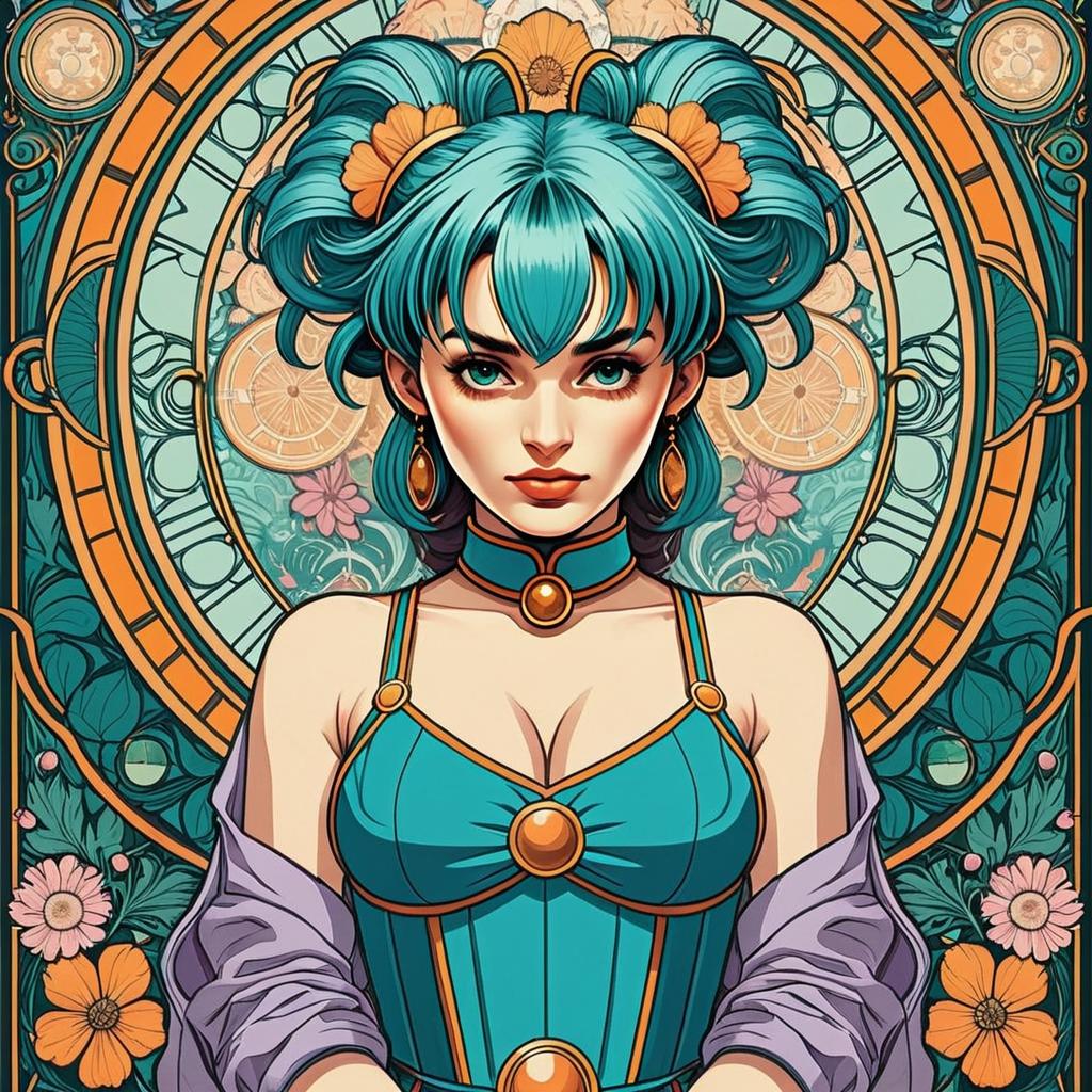 Art Nouveau Style Digital Portrait of Woman with Teal Hair and Floral Background