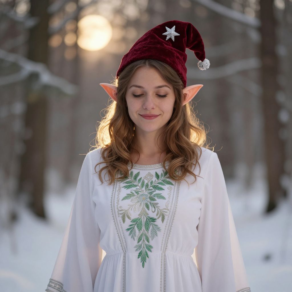 A serene young woman stands in a snowy forest wearing a festive red velvet elf hat adorned with a silver star and playful elf ears. She is dressed in a white gown featuring elegant green and gold embroidery, embodying a whimsical winter fantasy style.