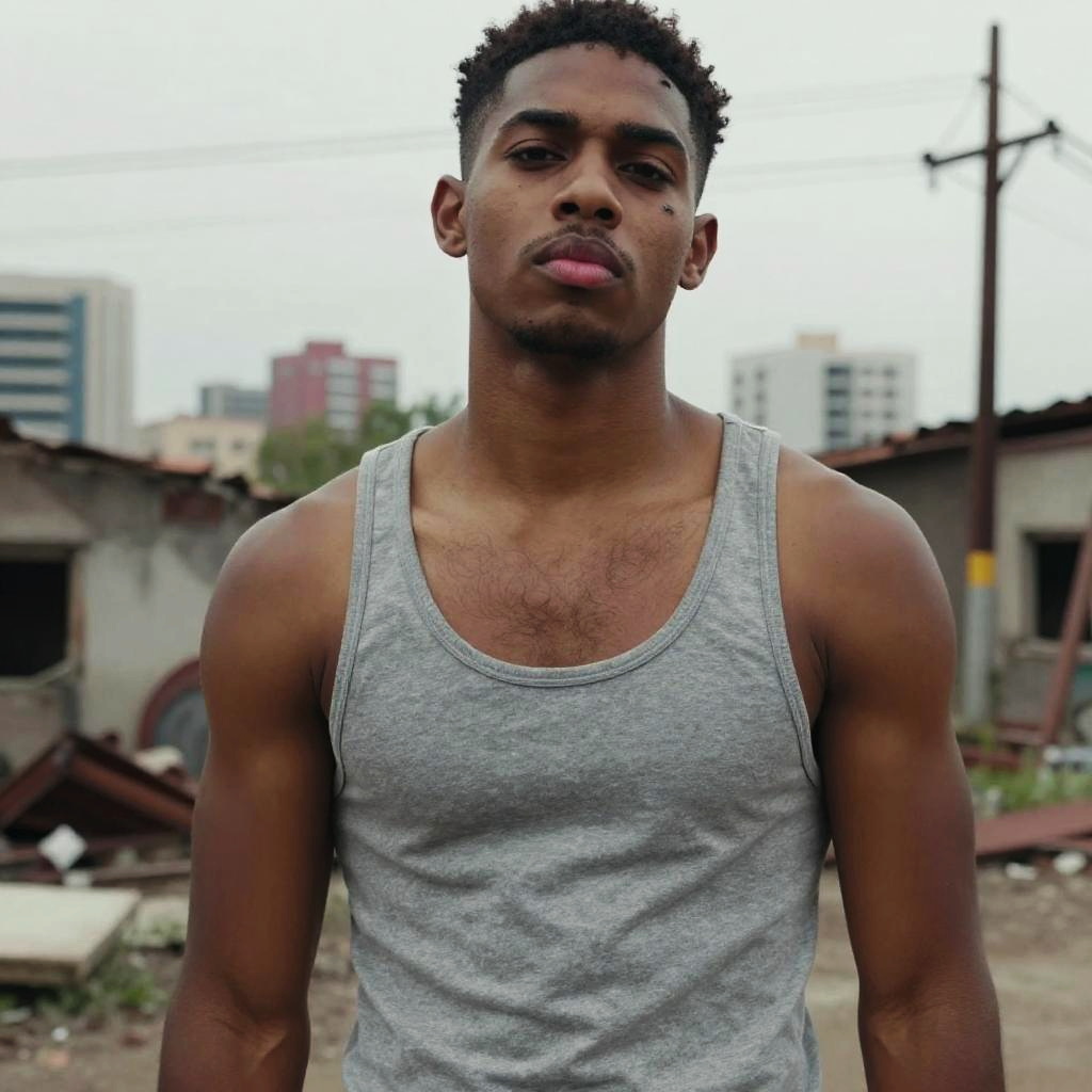A young man from Generation Z is captured outdoors in an urban setting, wearing a gray tank top and looking confidently at the camera. The background features a slightly blurred cityscape with buildings and utility poles, emphasizing a street-style aesthetic.
