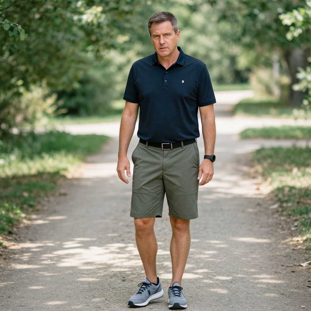 A man is walking down a tree-lined path wearing a navy blue polo shirt paired with olive green shorts and gray sneakers. The casual outdoor setting and his relaxed yet focused expression capture a serene moment in nature.
