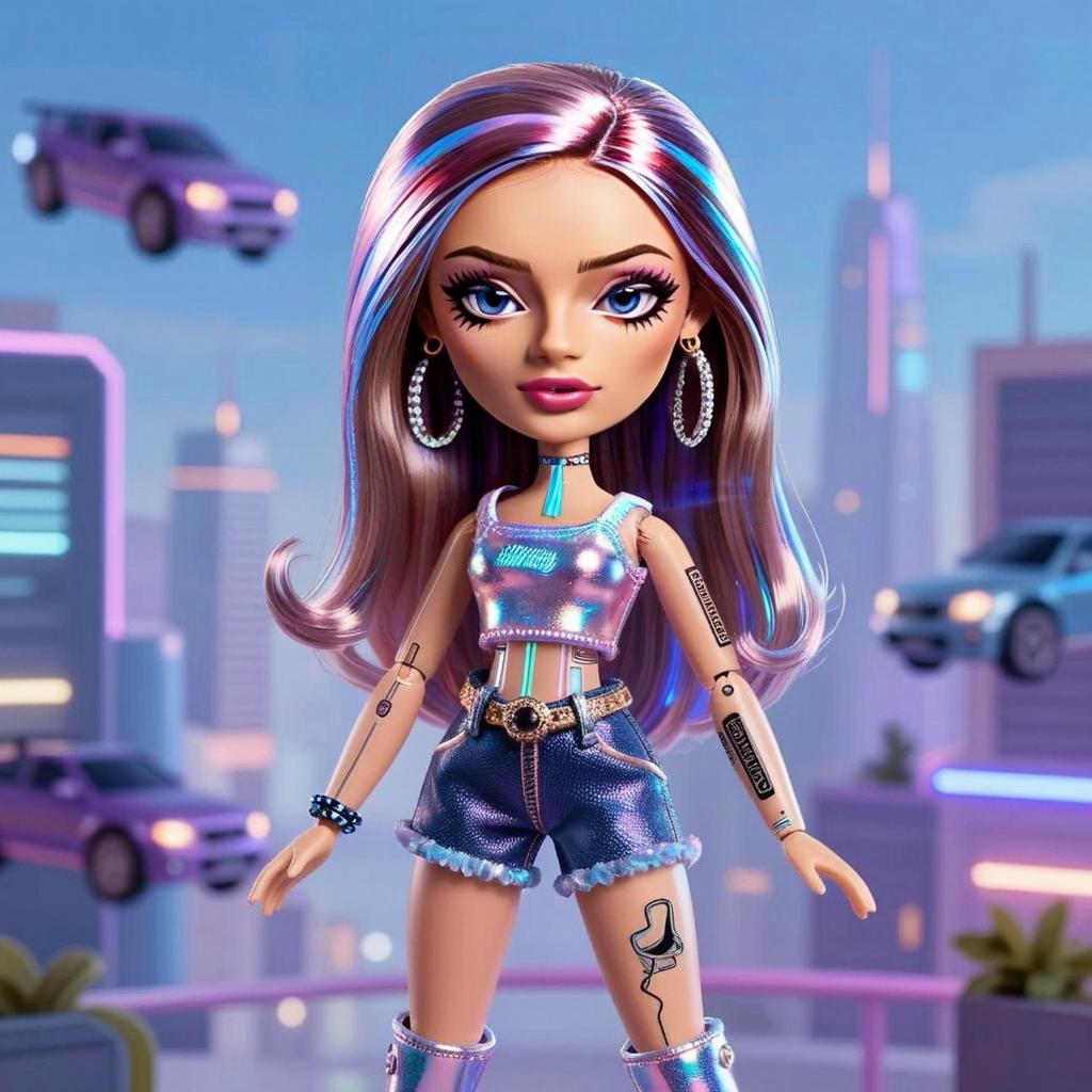 A futuristic, stylized 3D doll-like woman stands confidently in a vibrant urban setting with floating cars in the background. She sports shiny iridescent clothing, large hoop earrings, and detailed cybernetic tattoos, blending elements of cyberpunk and pop art aesthetics.