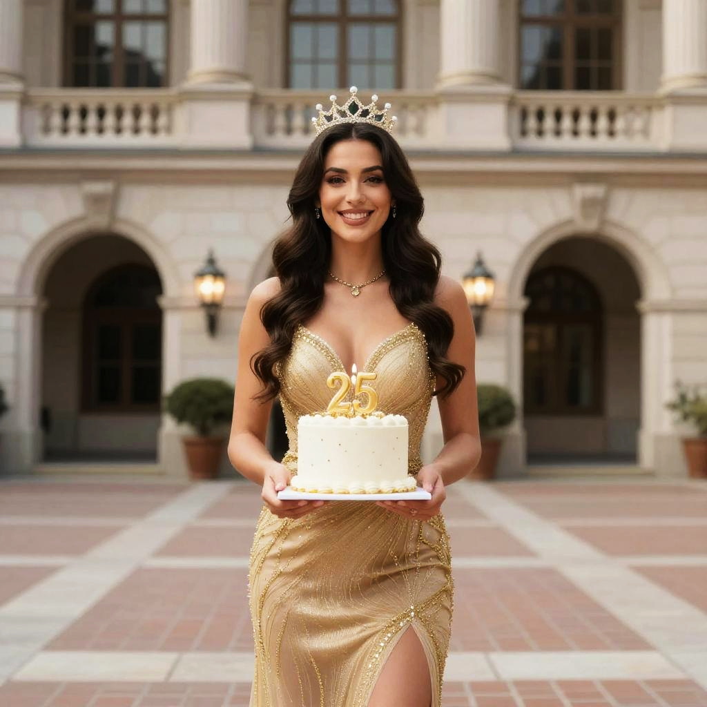 A woman dressed in an elegant gold gown and wearing a sparkling tiara holds a beautifully decorated white birthday cake with the number 25 candle on top. She smiles warmly, standing in front of a grand architectural background, capturing the celebratory moment in a sophisticated photoshoot style.