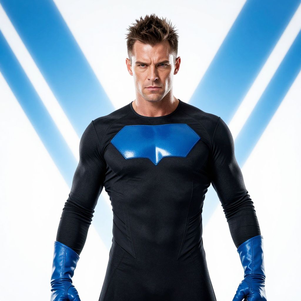A man dressed as a superhero stands confidently against a bright background featuring blue V-shaped light beams. He wears a sleek black suit with a shiny blue emblem on his chest and matching blue gloves, embodying a modern comic book hero style.