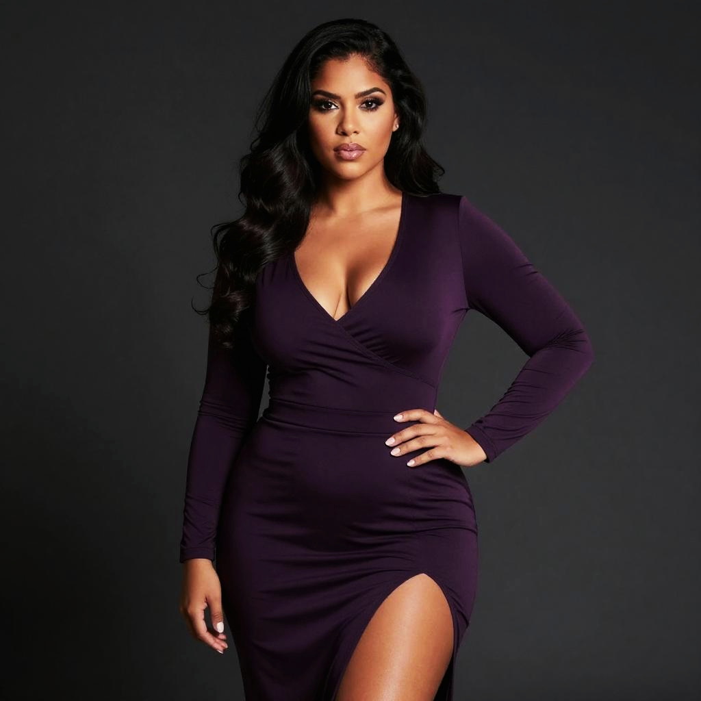 A confident woman poses against a dark backdrop wearing a form-fitting, long-sleeved purple dress with a deep V neckline and a high thigh slit. Her styled dark wavy hair and poised expression enhance the elegant and sophisticated vibe of this modern fashion portrait.