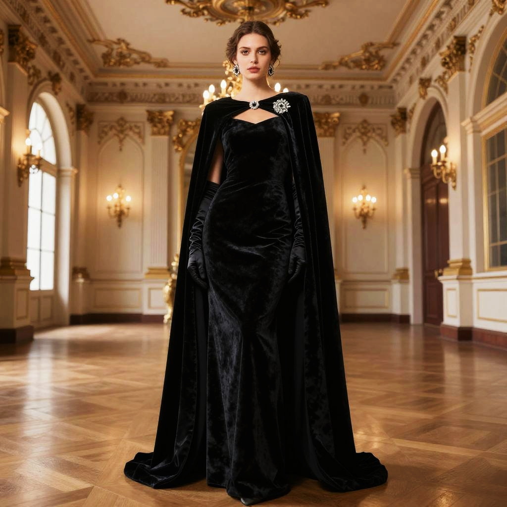 Elegant Woman in Black Velvet Gown and Cape in Luxurious Ballroom