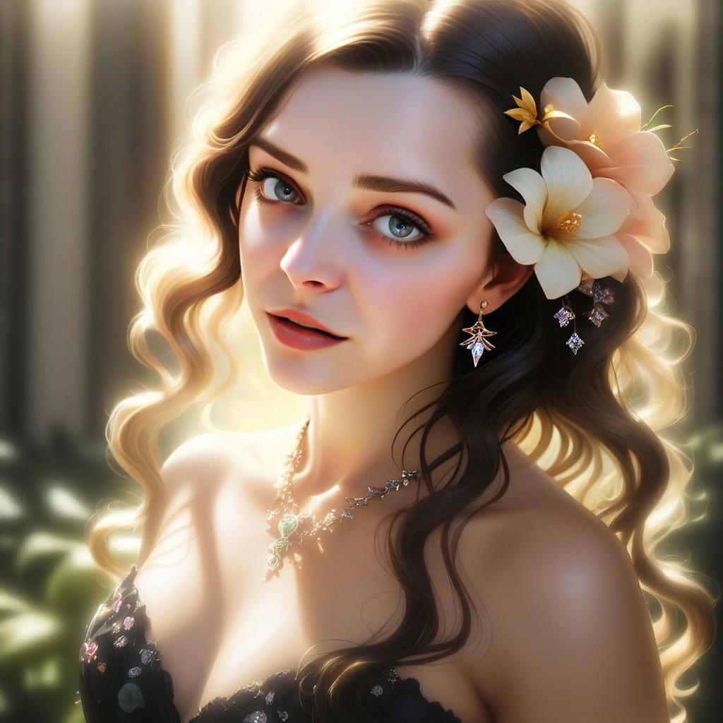 This digital artwork features a stunning woman with wavy, two-toned hair adorned with delicate flowers, showcasing intricate jewelry and soft, radiant lighting. Rendered in a highly detailed anime-inspired style, the image combines realistic skin textures with stylized facial features, capturing an ethereal and elegant atmosphere.