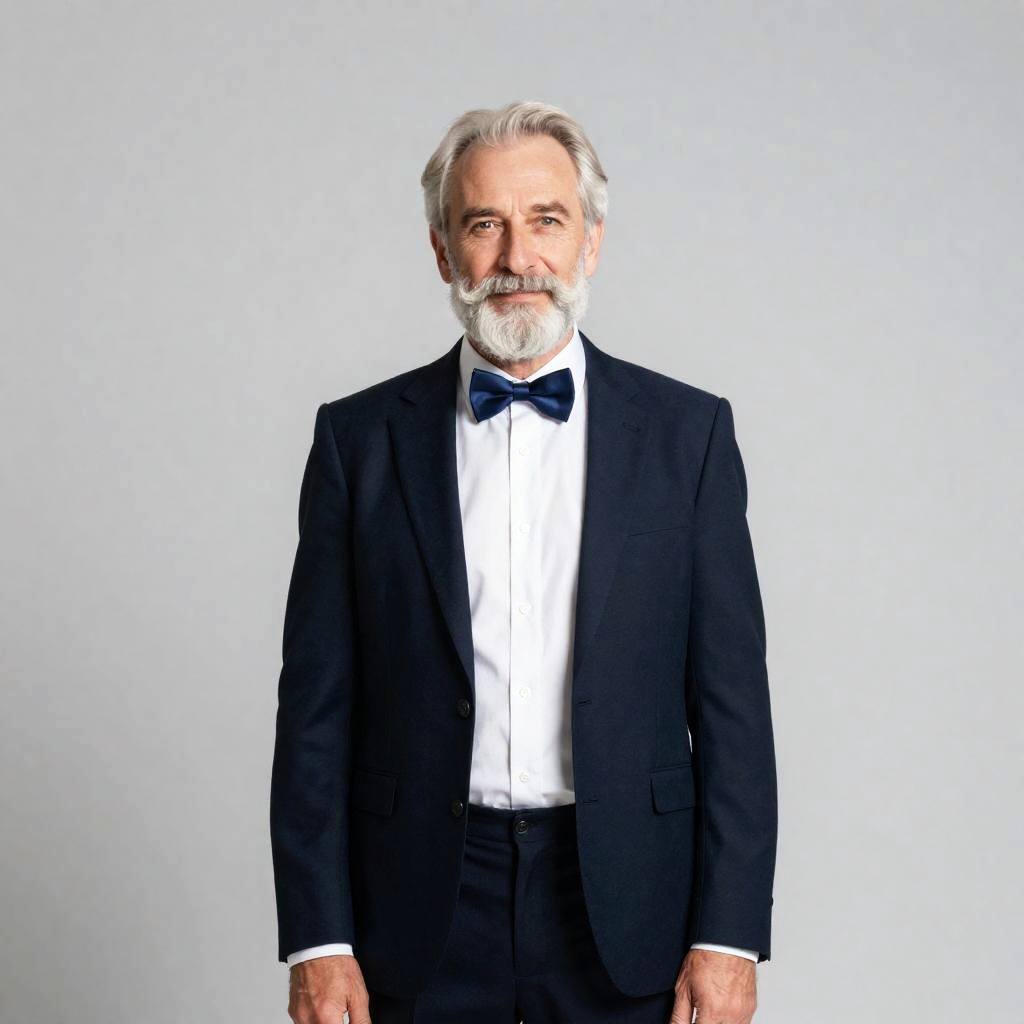 A distinguished older man with a well-groomed gray beard and hair is dressed elegantly in a dark suit with a white shirt and a blue bow tie. His confident and gentle smile complements his classic formal attire, perfect for special occasions or costume events.