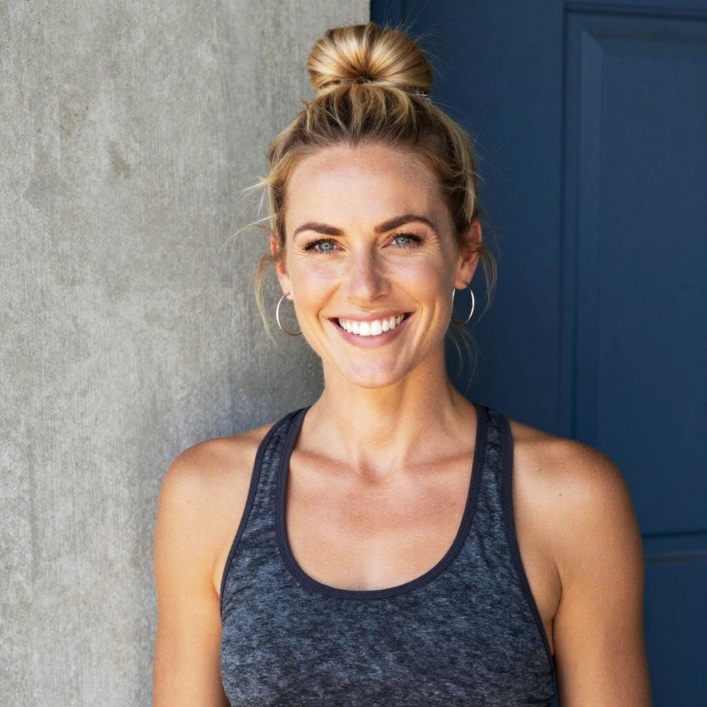 A cheerful woman with blonde hair styled in a top bun smiles brightly at the camera, dressed in a dark grey athletic tank top. She stands against a simple background with a concrete wall and a blue door, giving the portrait a casual, sporty vibe.