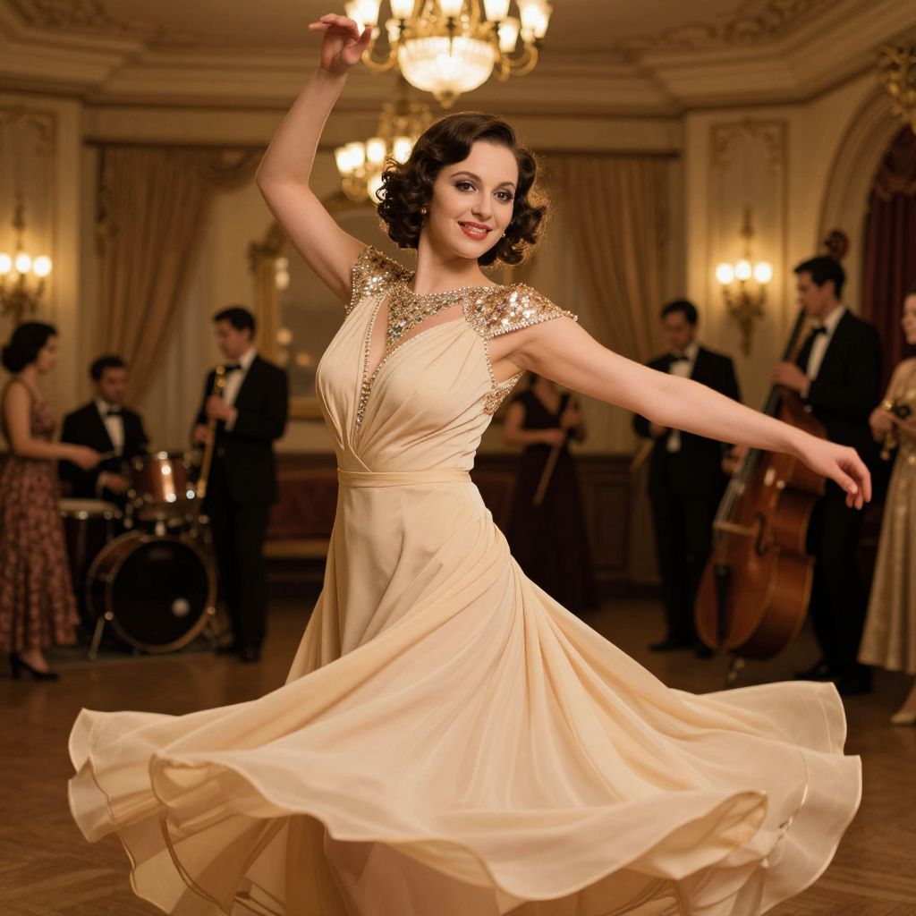 A woman in an elegant vintage-style dress gracefully twirls on a wooden dance floor in a lavishly decorated ballroom. In the background, a jazz band dressed in formal attire plays instruments, adding to the classic 1920s or 1930s ambiance of the scene.