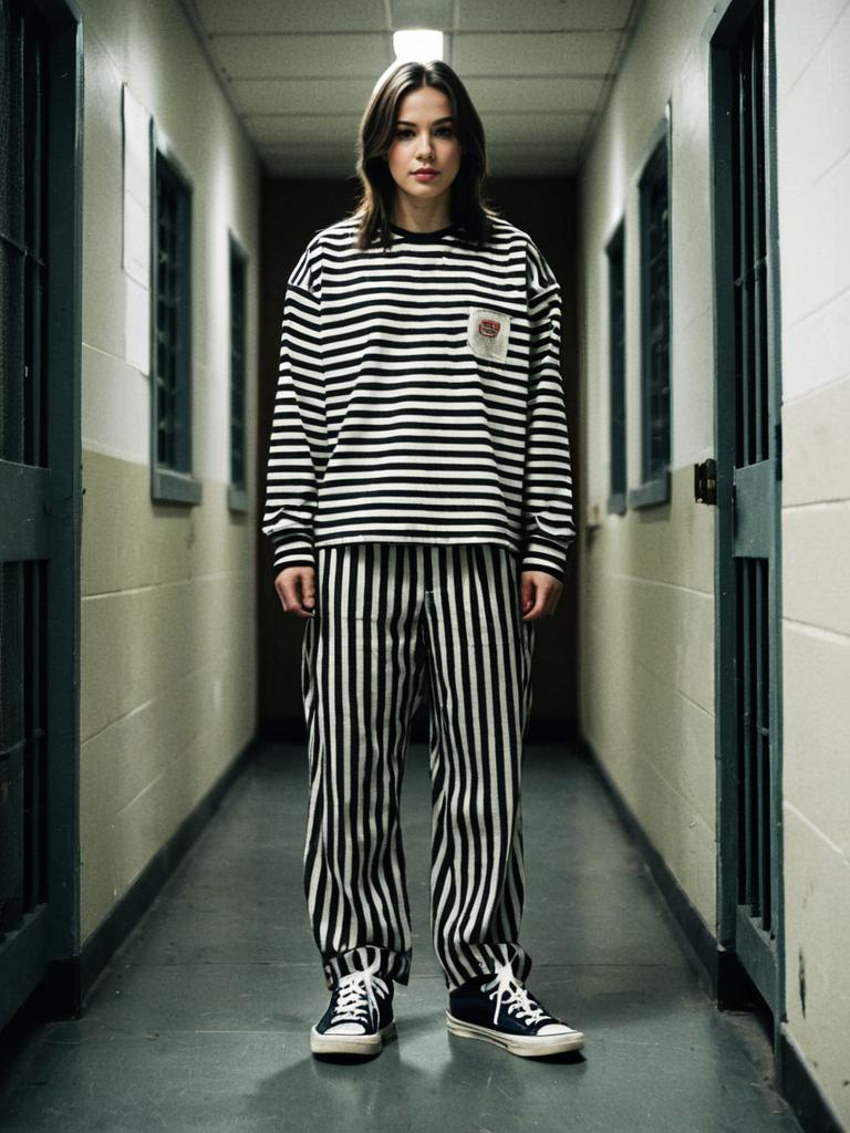 A young woman stands confidently in a narrow corridor wearing a realistic inmate girls costume featuring a black and white striped sweatshirt and pants. The image has a sharp focus on the subject with a moody yet clear lighting style typical for portraits in controlled indoor settings.