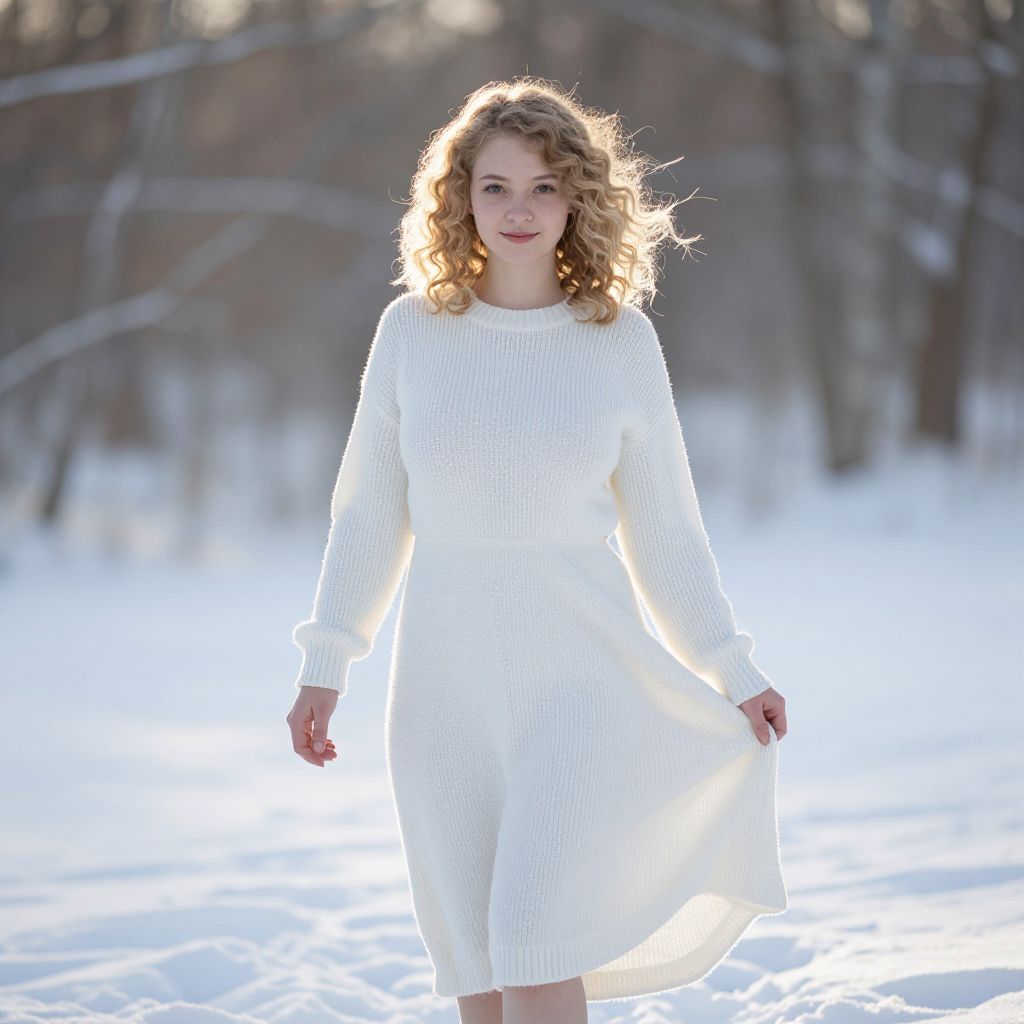 A young woman in a cozy white knit dress stands gracefully outdoors in a snowy landscape, with soft natural light highlighting her curly blonde hair. The serene winter setting and her gentle smile create a peaceful and elegant atmosphere.