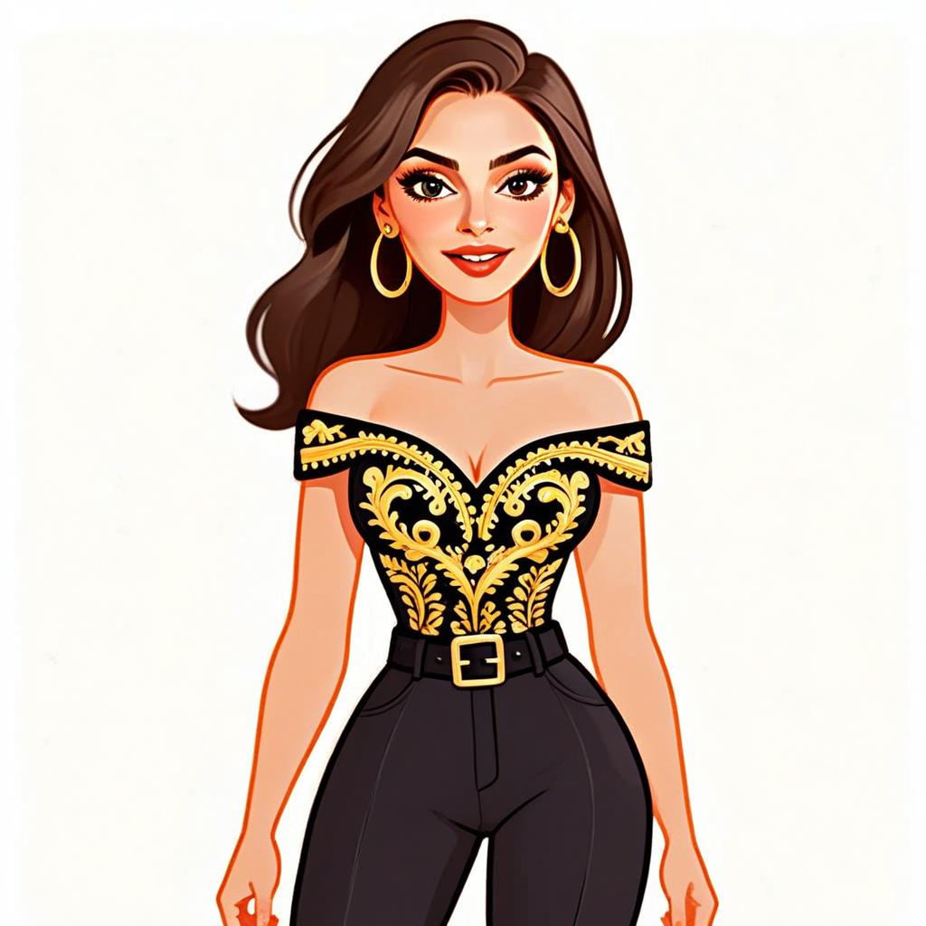 This digital illustration features a confident woman with flowing dark hair and a radiant smile. She is dressed in a stylish off-the-shoulder black top adorned with intricate golden embroidery, paired with high-waisted black pants and large hoop earrings, embodying modern glamour and sophistication.