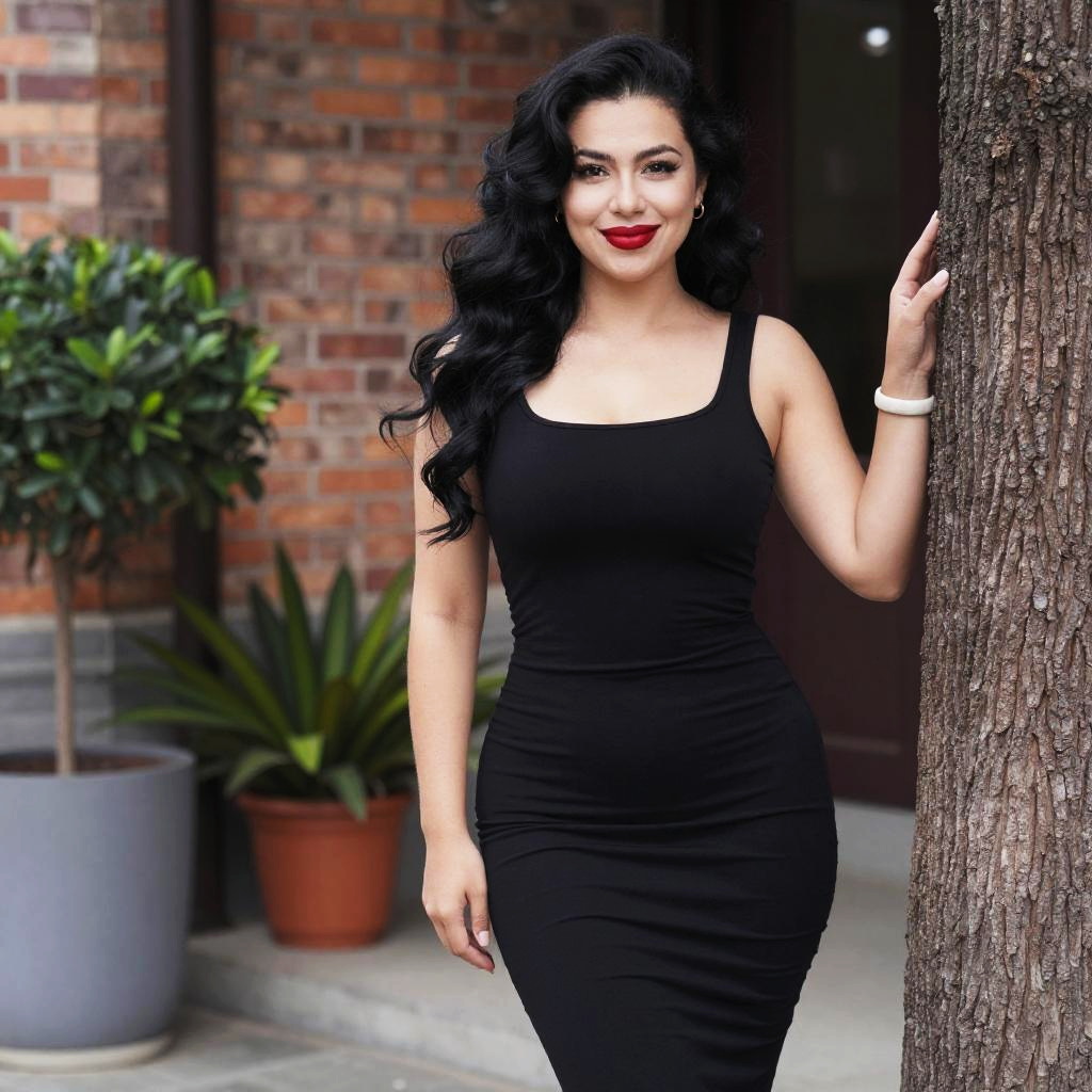 A confident woman with long, curly black hair poses outdoors against a tree while wearing a sleek, fitted black dress. Her vibrant red lipstick and subtle accessories complement her stylish and elegant look in this urban setting with potted plants and a brick wall background.