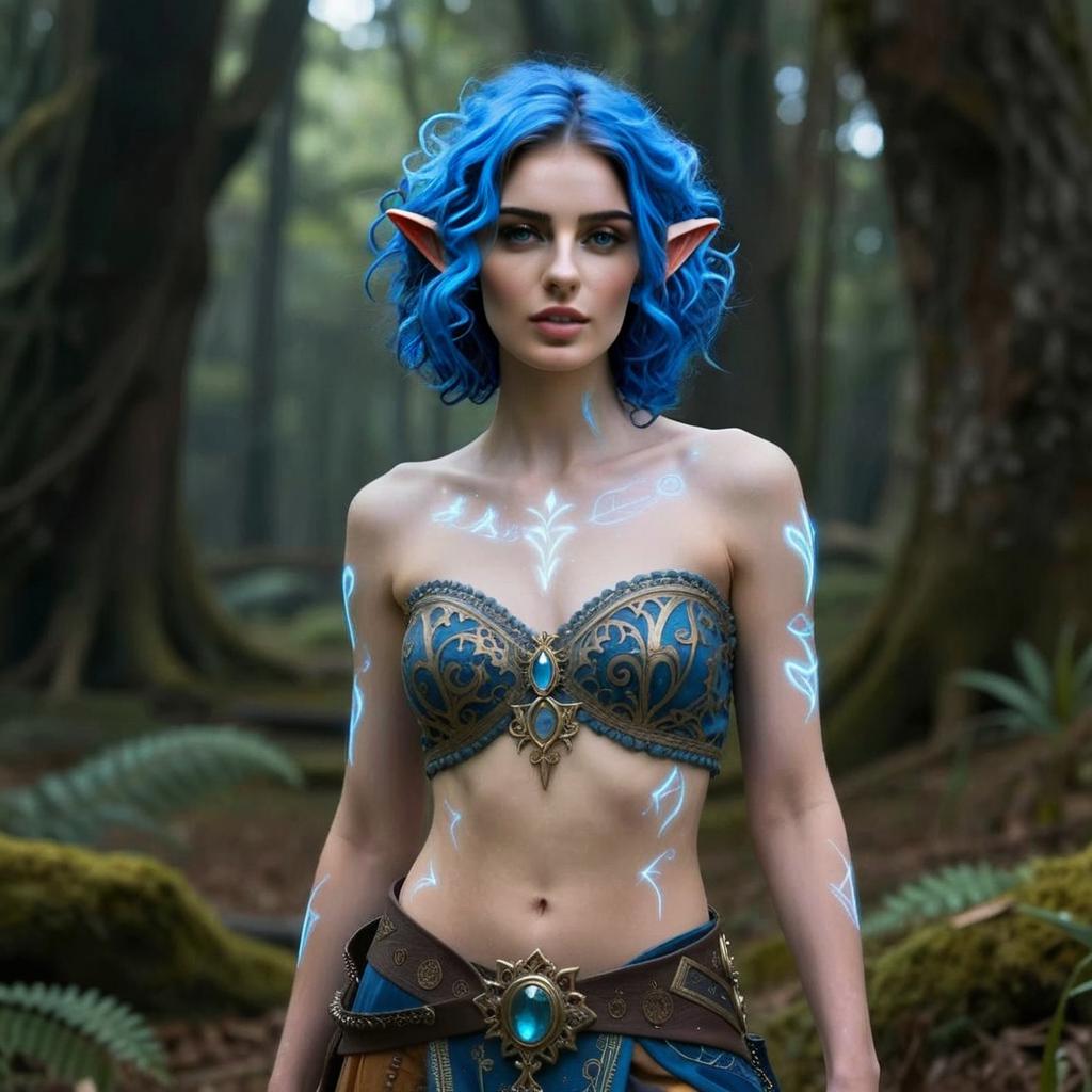A fantasy-inspired woman with striking blue hair and pointed elf ears stands in a mystical forest setting. She wears an intricately designed blue and gold corset with glowing runic tattoos adorning her skin, embodying a magical and ethereal aesthetic.