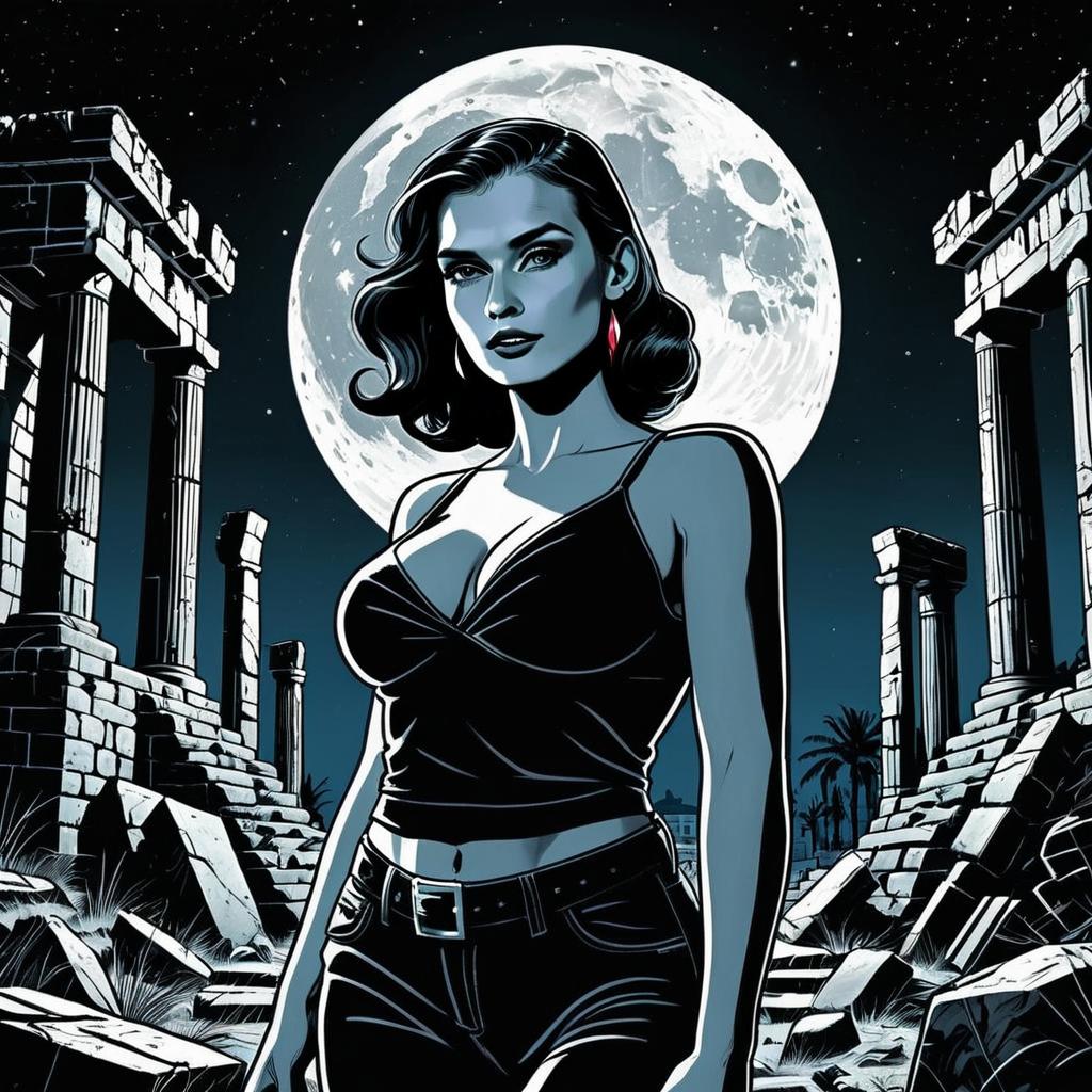 A stylized digital illustration of a confident woman standing amidst ancient ruins under a large full moon. The artwork features a noir-inspired palette with strong contrasts and detailed shading, capturing a mysterious night scene with classical pillars and scattered stones.