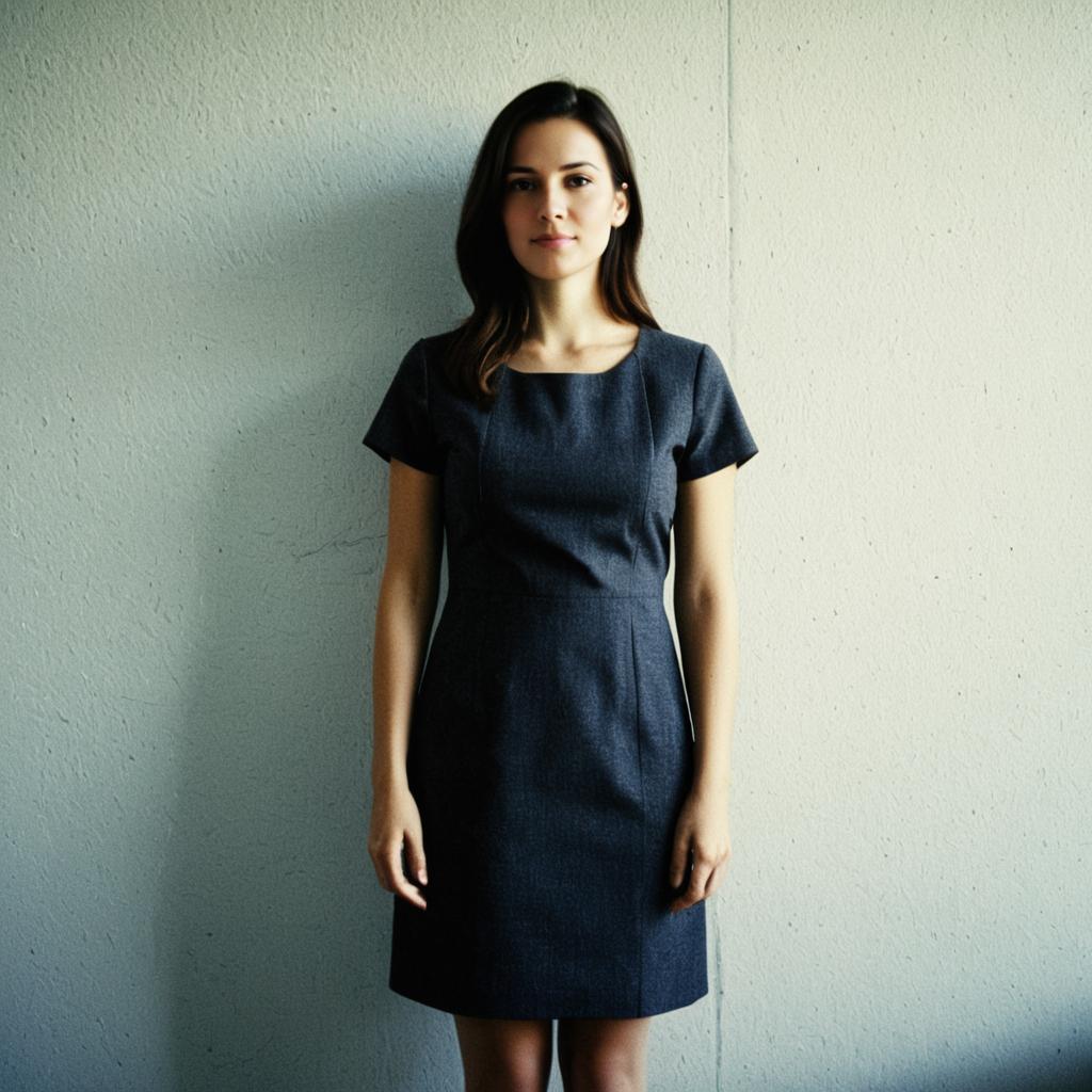A woman stands confidently in front of a textured gray wall, wearing a simple and elegant short-sleeved office dress. The minimalist style of the dress combined with the neutral background creates a professional and modern atmosphere.