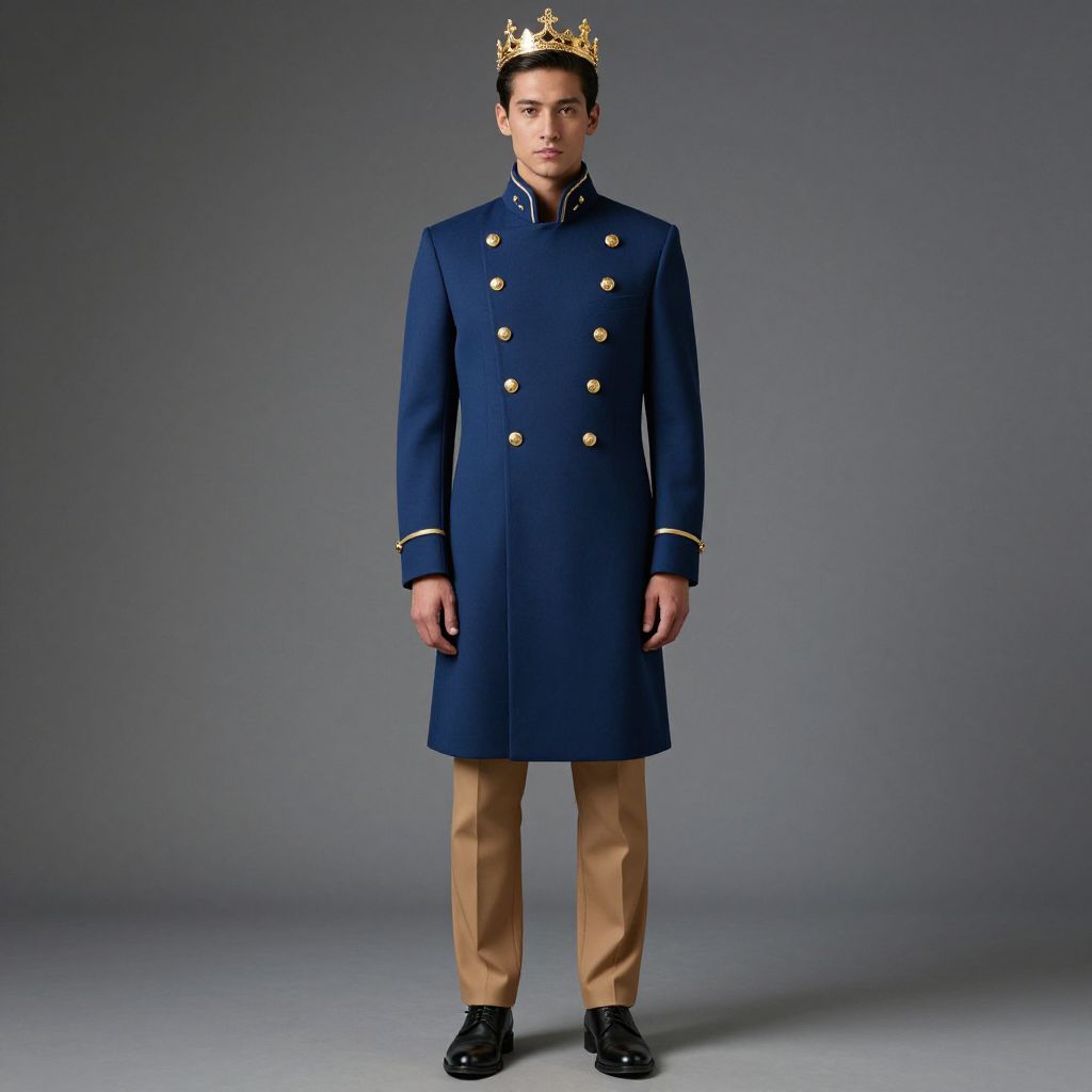 Man in Regal Navy Blue Military Coat with Crown Standing Against Gray Background