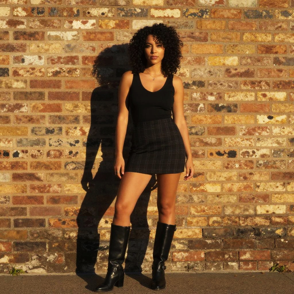 A confident Gen Z woman stands against a textured brick wall, bathed in warm sunlight that casts a strong shadow behind her. She wears a stylish black tank top paired with a plaid mini skirt and knee-high leather boots, embodying a modern urban fashion vibe.