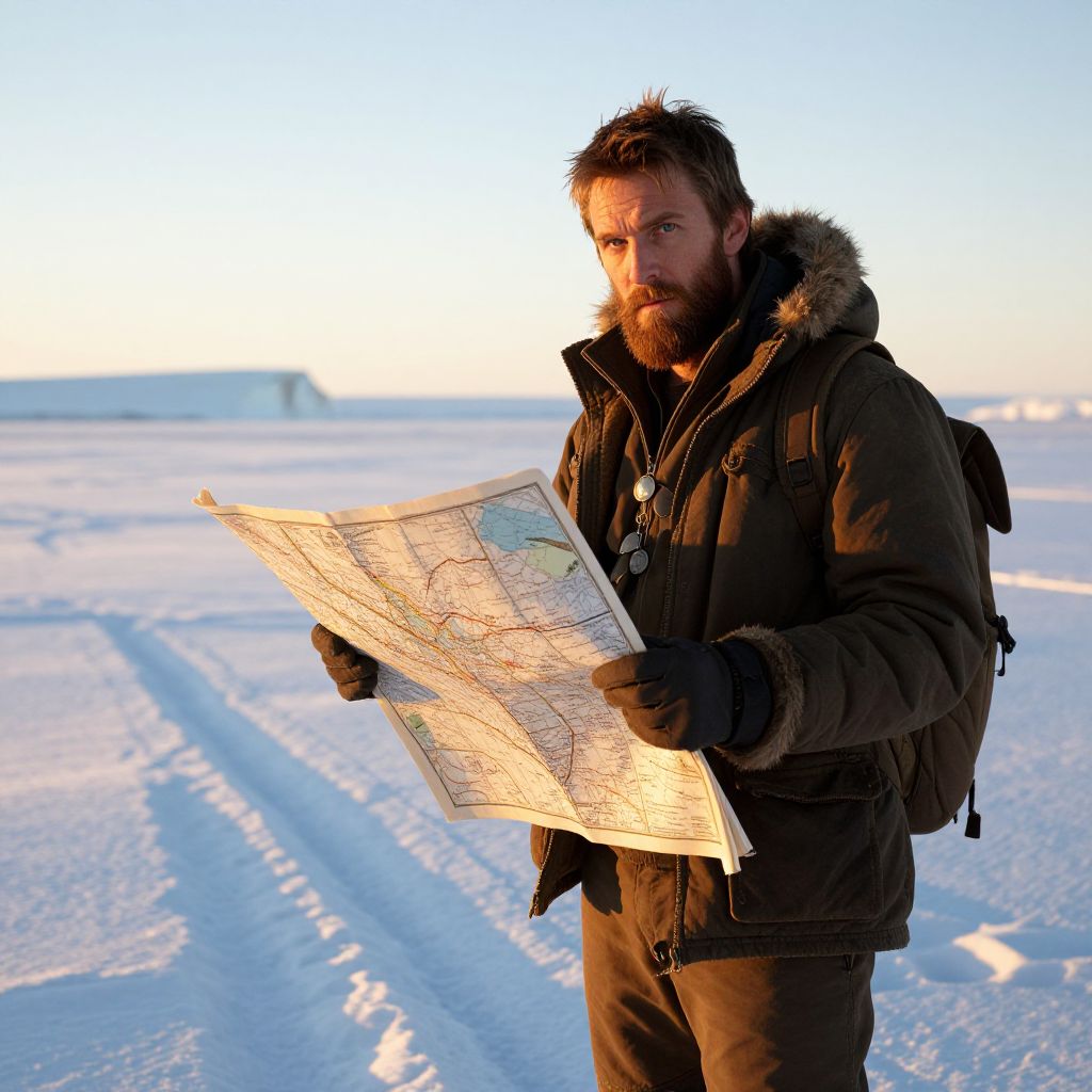 Man Exploring Arctic Wilderness with Map in Winter Gear