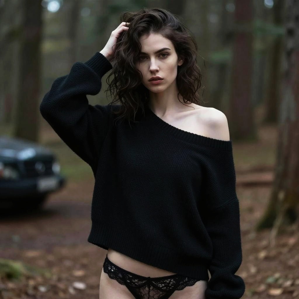 A young woman stands in a forest with a serious expression, wearing an off-shoulder black sweater paired with black lace underwear. The natural outdoor setting contrasts with her bold fashion choice, creating a striking, moody portrait.