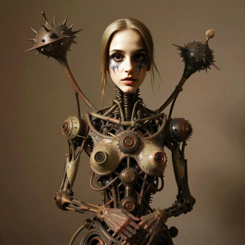 A striking steampunk-inspired woman merges human features with intricate mechanical parts, including gears and spiked metal components. Her pale face contrasts with dark, dramatic eye makeup, creating a haunting cybernetic aesthetic.