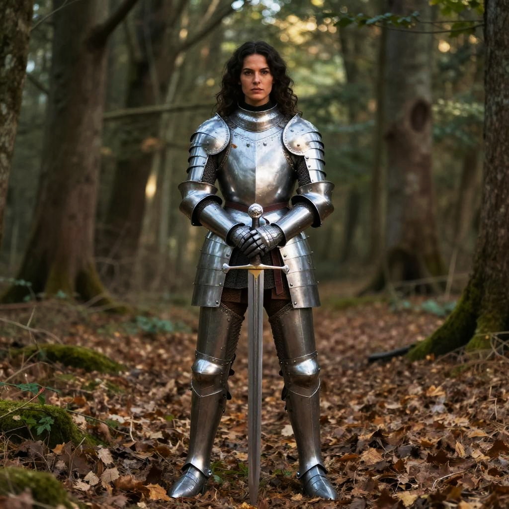 A determined woman stands in a forest wearing full medieval-style plate armor, holding a longsword with both hands pointed downward. The natural setting combined with her serious expression evokes a blend of historical realism and fantasy themes.