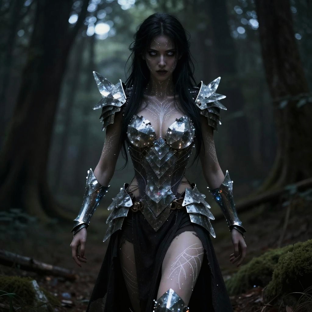 A fierce woman dressed in reflective, spiked armor stands confidently in a dark, misty forest. Her intense gaze and intricate body markings enhance the fantasy warrior aesthetic, blending elements of medieval armor with dark fantasy style.