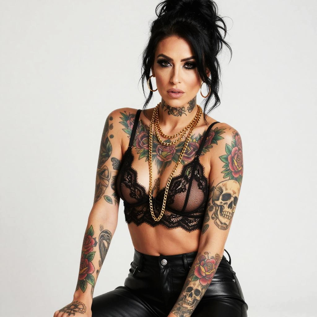 Edgy Tattooed Woman in Black Lace Bralette and Leather Pants