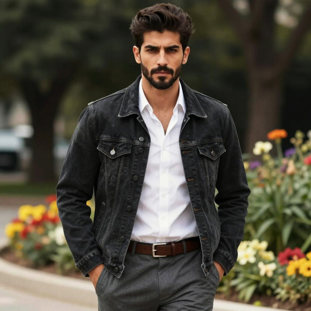 A confident young man with a well-groomed beard and styled hair walks outdoors in an urban park setting. He is dressed in a modern casual outfit featuring a black denim jacket over a crisp white shirt, paired with grey trousers and a brown belt, embodying a fashionable Gen Z style.