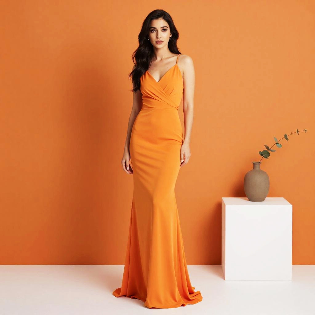 A stylish woman poses confidently against an orange backdrop, wearing a sleek, floor-length orange gown with thin straps and a flattering wrap detail at the bust. The minimalist setting is enhanced by a simple white pedestal holding a neutral-tone vase with a sprig of greenery, emphasizing modern elegance.
