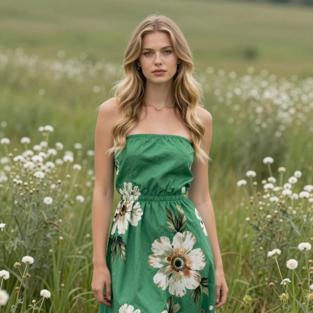 A young woman stands in a lush green meadow filled with white wildflowers, wearing a strapless green dress adorned with large floral prints. Her blonde hair cascades in soft waves, complementing the natural and serene outdoor setting, capturing a peaceful and fresh summer vibe.