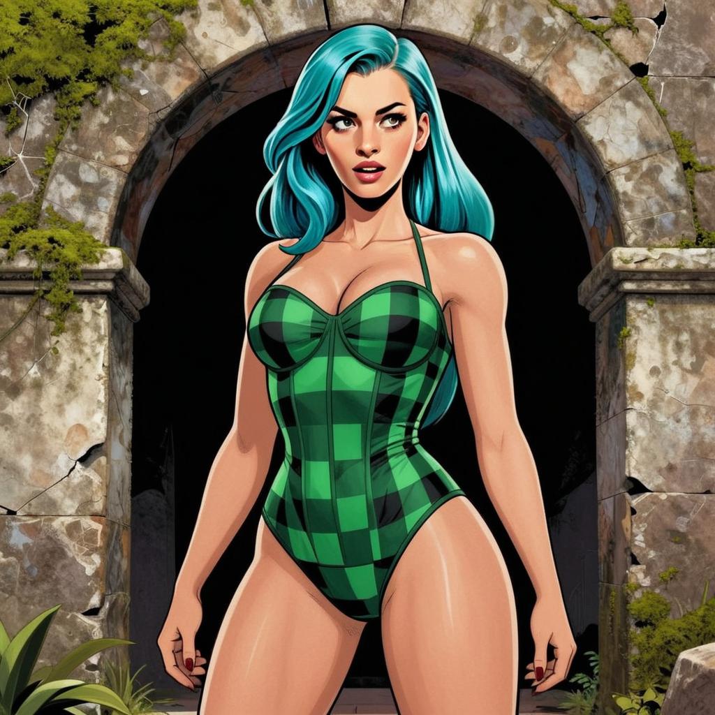 A striking digital illustration of a confident woman with vibrant teal hair wearing a green checkered one-piece swimsuit, standing in front of an ancient stone archway covered in moss. The artwork features a comic book style with bold lines and vibrant colors, highlighting the character's strong and dynamic presence.
