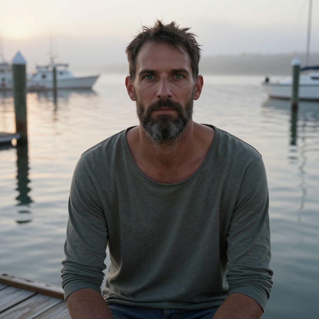 A contemplative man with a beard and short hair sits on a wooden dock by a calm marina at dawn or dusk. The serene background features blurred boats and gentle water reflections, adding to the tranquil, introspective mood of the scene.