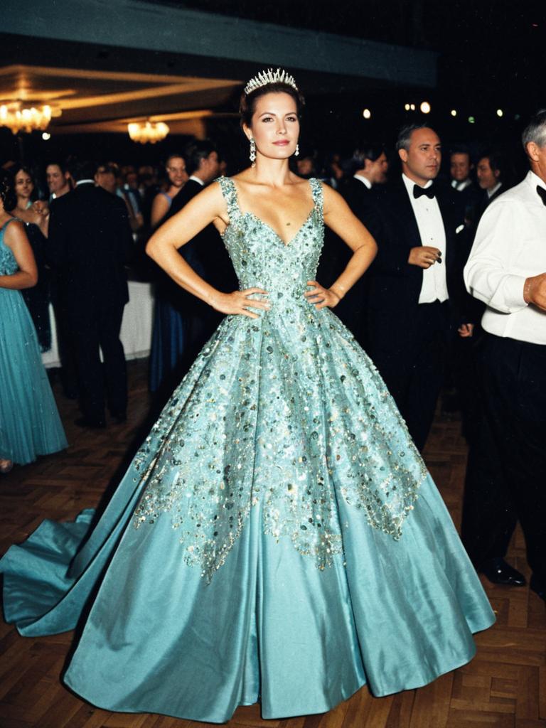 A woman confidently poses in a stunning, embellished aqua-blue party gown at a formal gala event. The elegant dress features intricate beadwork and a voluminous skirt, complemented by a sparkling tiara, highlighting a classic evening wear style in a photorealistic setting.