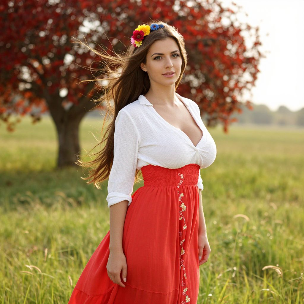 A young woman stands gracefully in a lush field, wearing a white top paired with a vibrant red dress adorned with floral embroidery. Her long hair flows gently in the breeze, accented with colorful flowers, against a backdrop of a tree with deep red foliage, evoking a romantic and natural vibe.