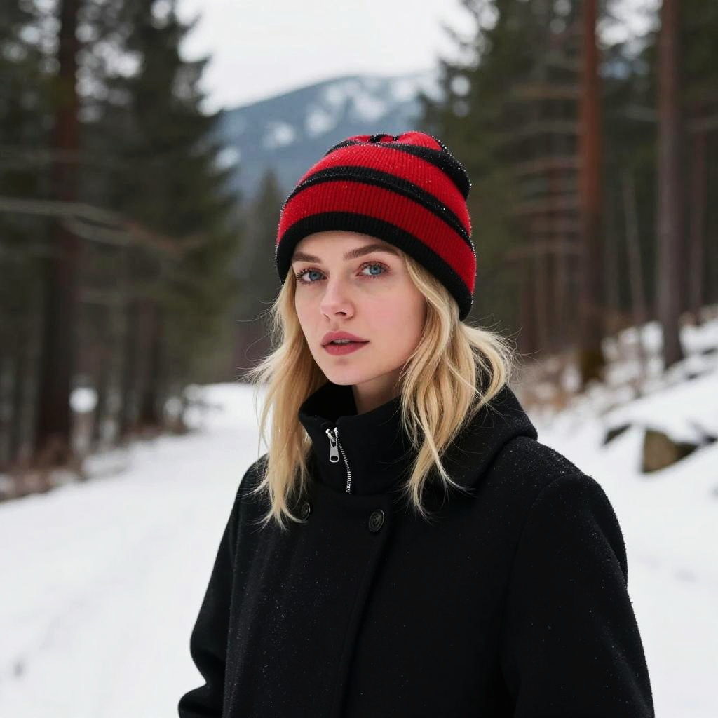 A young woman with blonde hair, wearing a red and black striped knit beanie and a black coat, stands outdoors in a snowy forest setting. The serene winter landscape features snow-covered ground and tall trees, creating a calm and contemplative atmosphere.