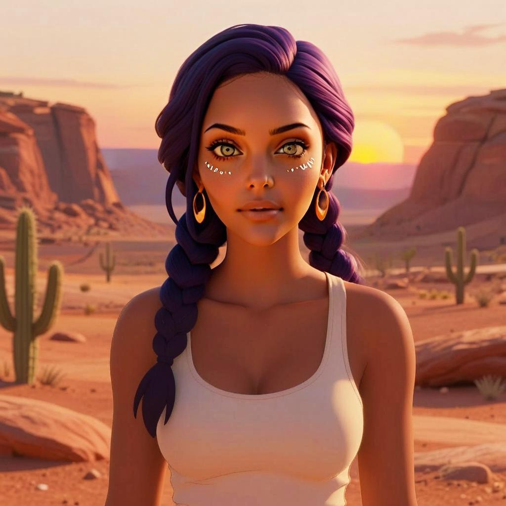 A digitally rendered portrait of a young woman with striking purple braided hair standing in a desert landscape during sunset. She wears a white tank top and gold hoop earrings, with small white decorative markings under her eyes, blending a modern and slightly fantasy-inspired style.