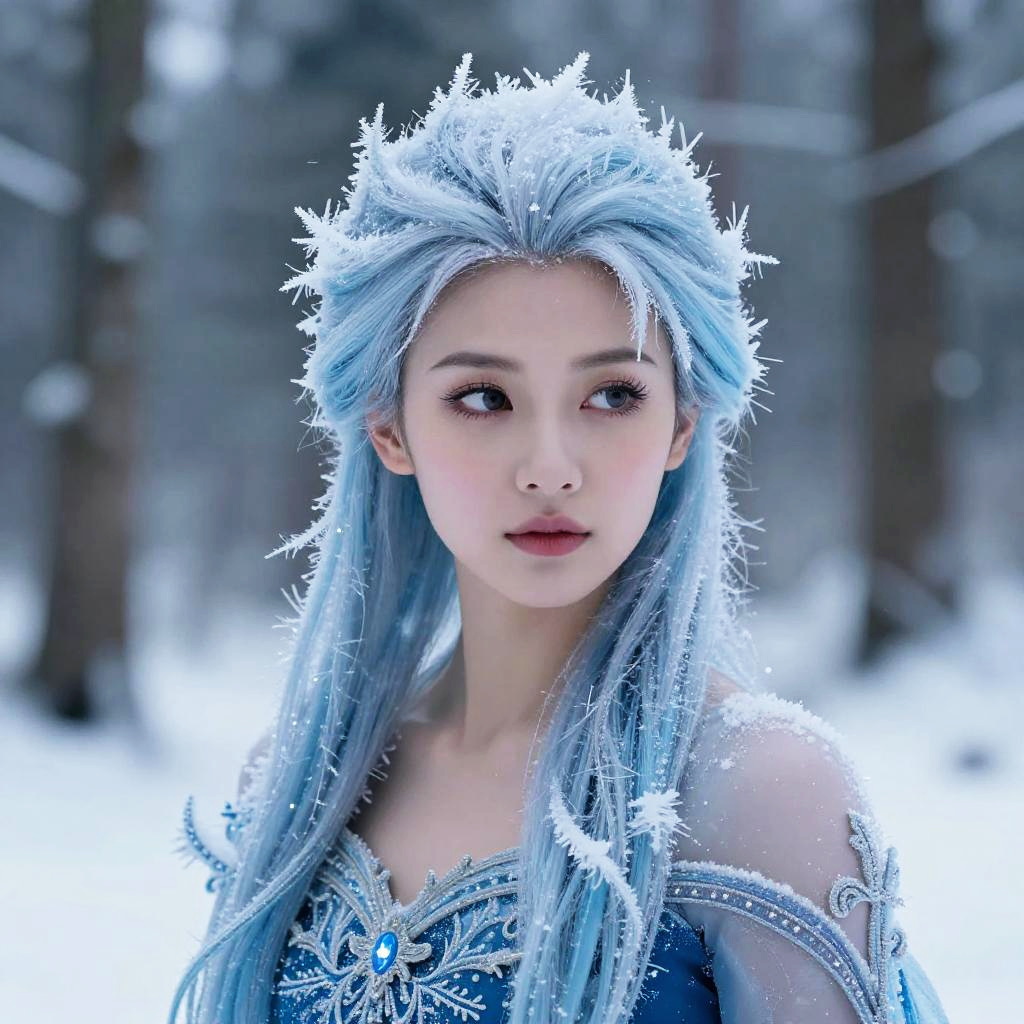 A woman with icy blue hair styled with frost and snowflakes stands in a snowy forest, wearing an elaborate blue and silver gown adorned with sparkling jewels and intricate embroidery. Her ethereal appearance is enhanced by the delicate frost detailing on her hair and shoulders, evoking a magical winter queen or fantasy ice princess aesthetic.