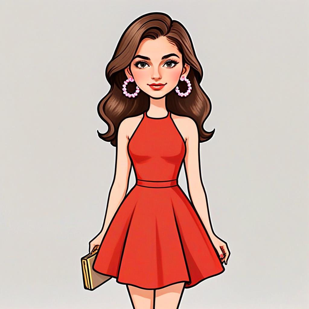 A stylish cartoon illustration of a woman with a pretty face and wavy brown hair. She is wearing a vibrant red halter neck dress, accessorized with large pink hoop earrings, and holding a clutch bag, presenting a confident and cheerful demeanor.